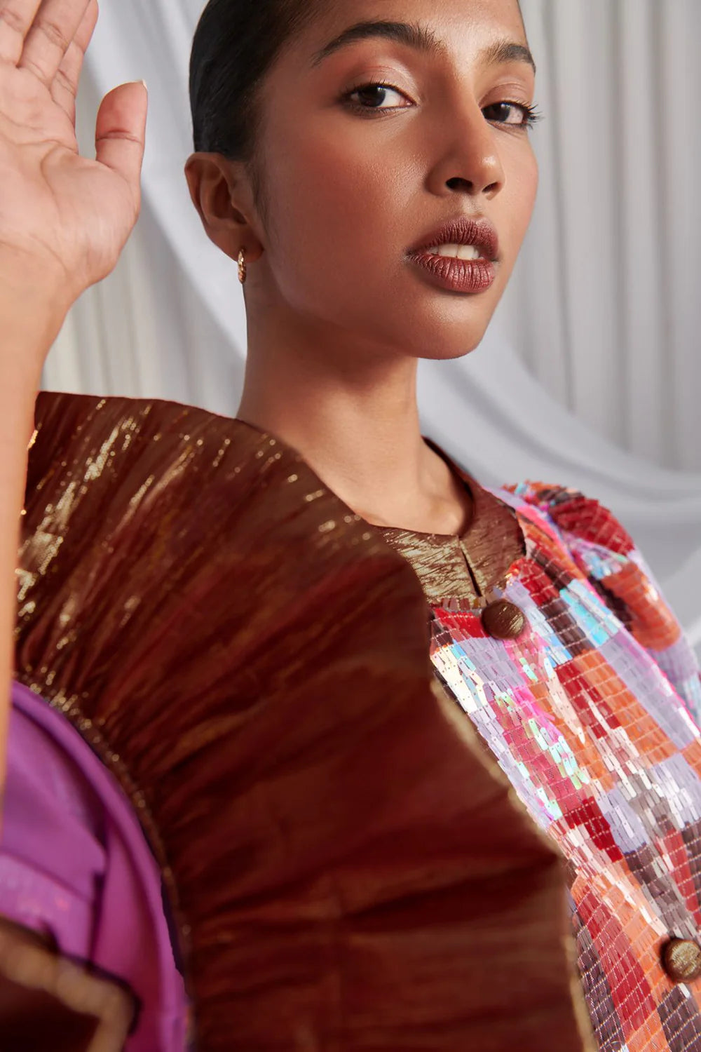 The Osiris Love Dress shines with its patchwork-inspired sequin design in pink, red, and metallic hues. Featuring voluminous sleeves with pleated cuffs and a flowing silhouette, this maxi dress is both bold and elegant. One of our house pieces, reimagined with this seasons' print. A true statement piece for evening celebrations.