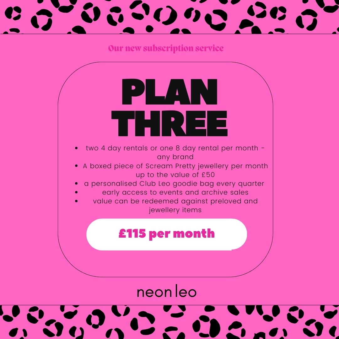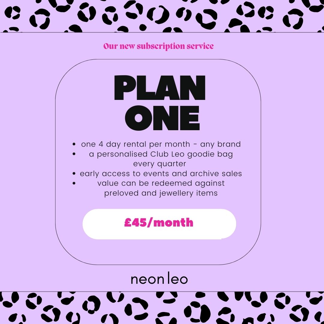 - One rental item of your choice for four days per month OR preloved + jewellery purchases up to the value of £45 per month. Credit can be accumulated to be spent at a later date up to the value of £35/month.